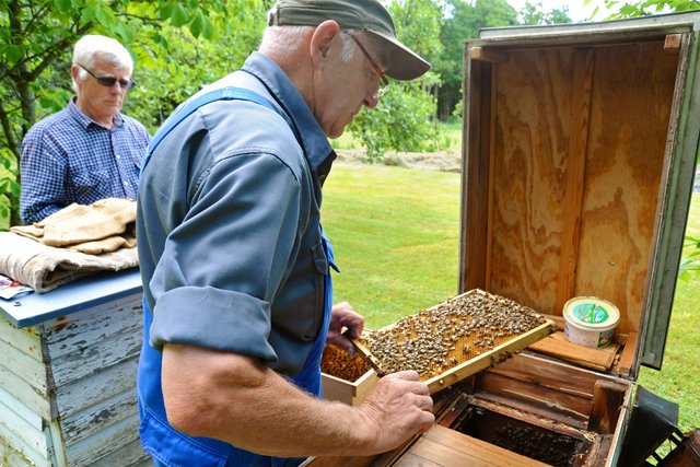 Vi har fået delt familierne efter Læsø modellen omkring månedsskiftet maj-juni, siden er der ikke gået sværme, og siden har vejret været til noget andet end biavl med store udbytter. Meget af den honning, som sad i tavlerne sidst i maj har bierne selv skullet bruge. På slyngedagen havde vi derfor god tid i Lægeurtehaven, som vi holdt med publikum den 8. juli.